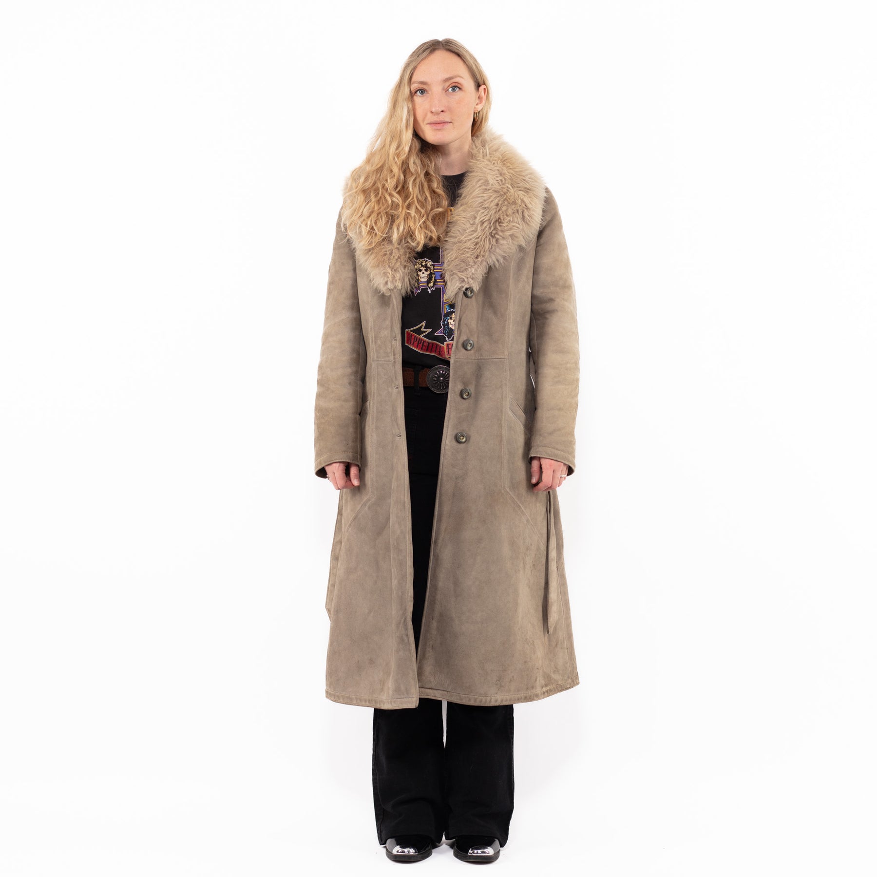 What it is: Vintage 70's Women Sheepskin Coat in Beige — genuine sheepskin (shearling), one-of-a-kind vintage.