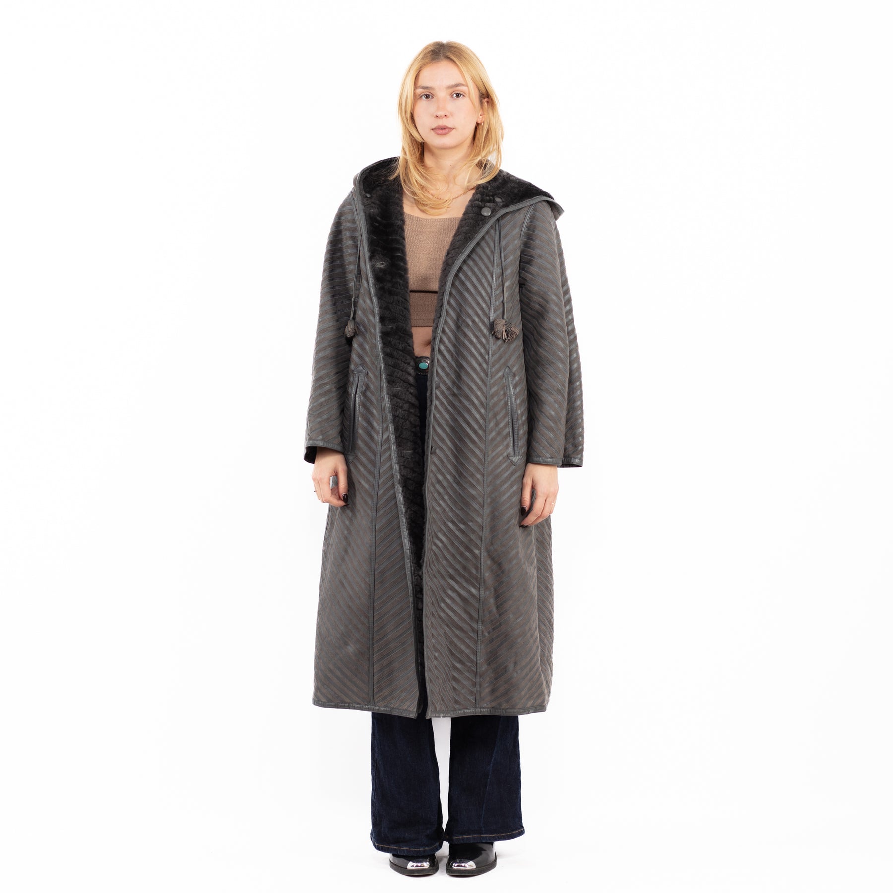 Gray Vintage 80's Women Reversible Sheepskin Long Coat in Gray With Free Delivery