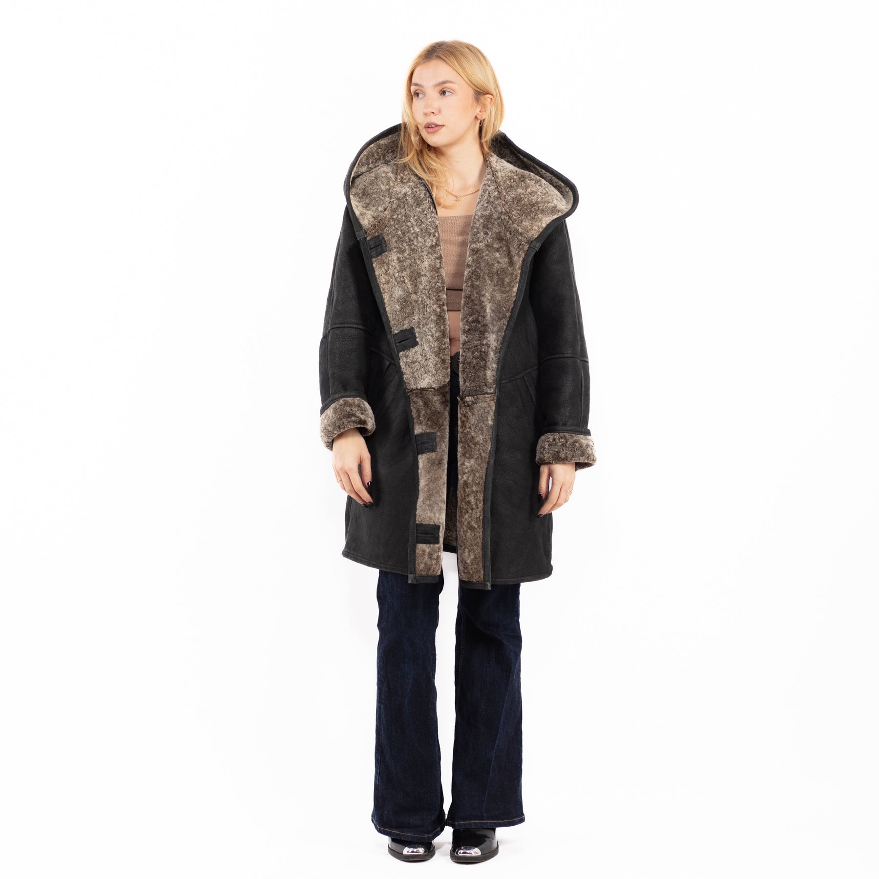 Black Vintage 90's Women Hooded Sheepskin Coat in Black With Free Delivery