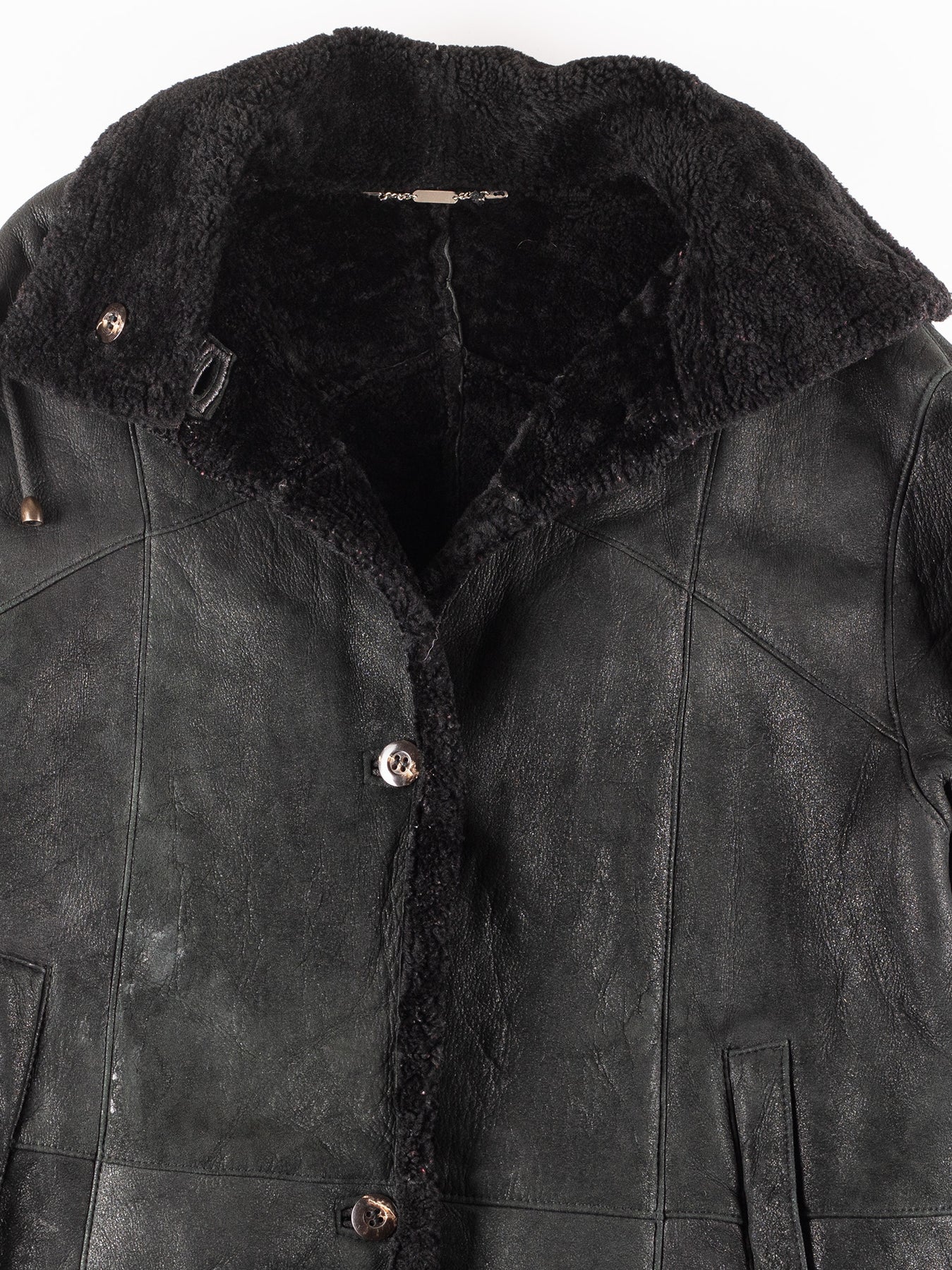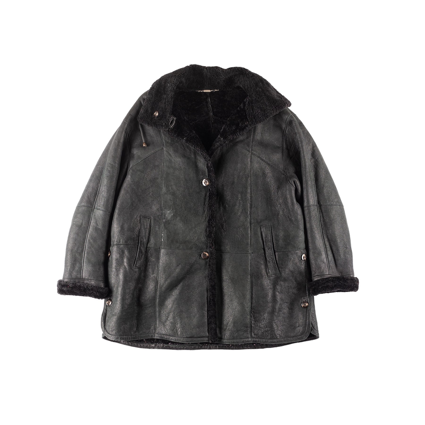 Shows visible overall wear consistent with age. Leather has natural creasing and light surface wear throughout, adding vintage character. Minor wear areas visible on sleeves and body. Shearling lining remains intact and functional. No major structural defects observed.