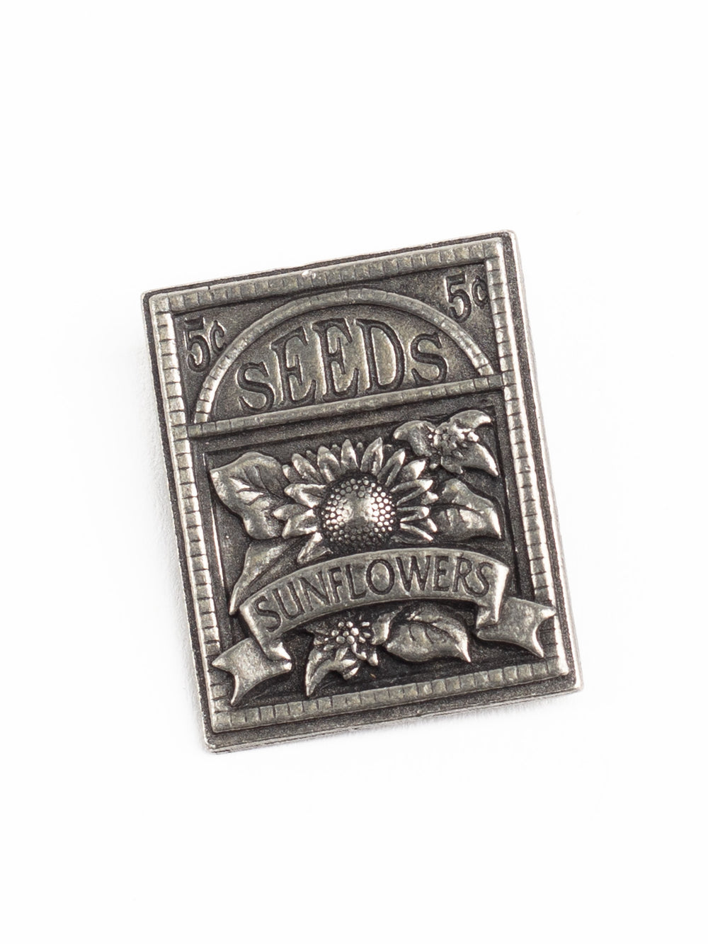 2003 Birds & Blooms Sunflower Seed Packet Brooch – Vintage Pewter Garden Pin
