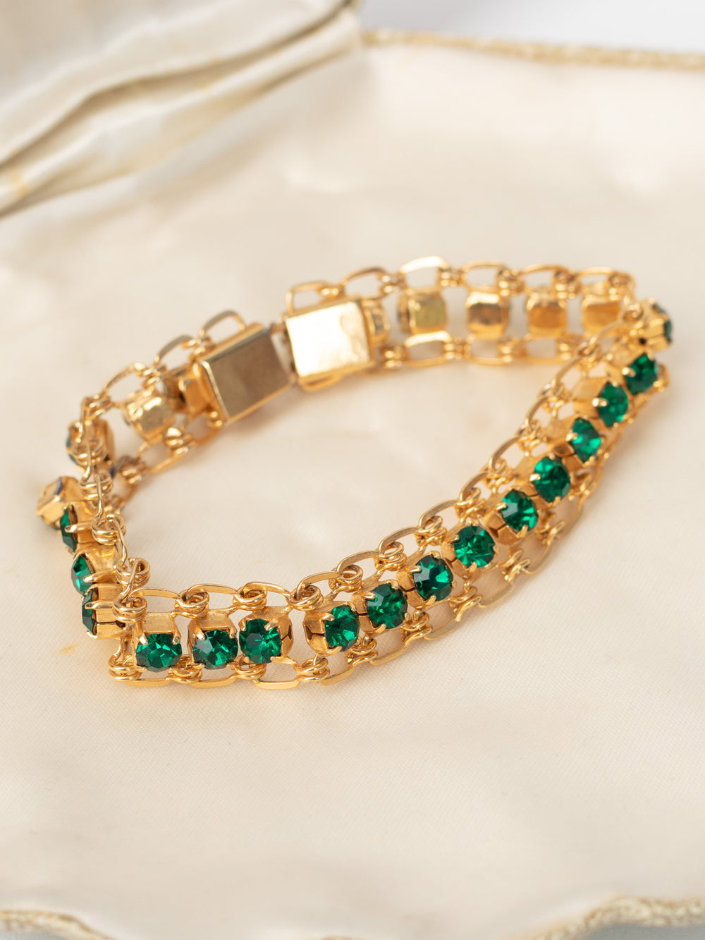 This striking vintage bracelet features two rows of vivid emerald-green rhinestones set in a bright gold-tone openwork chain. The mid-century link construction adds texture and dimension while keeping the bracelet lightweight