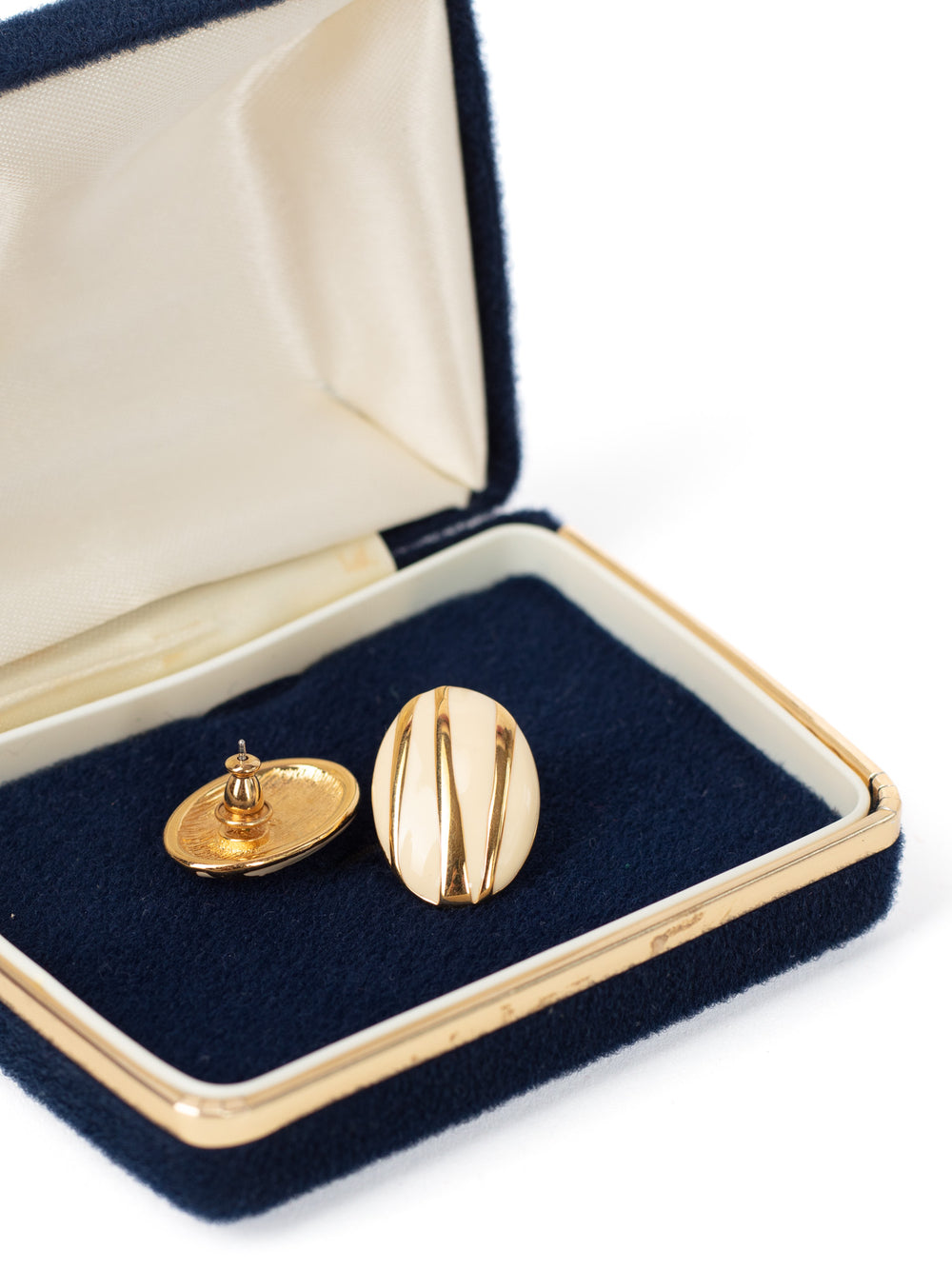Chic and sleek, these 1980s Monet earrings feature a refined oval shape in glossy cream enamel with gold-tone diagonal striping. Perfect for fans of timeless design or collectors of classic Monet costume jewelry.