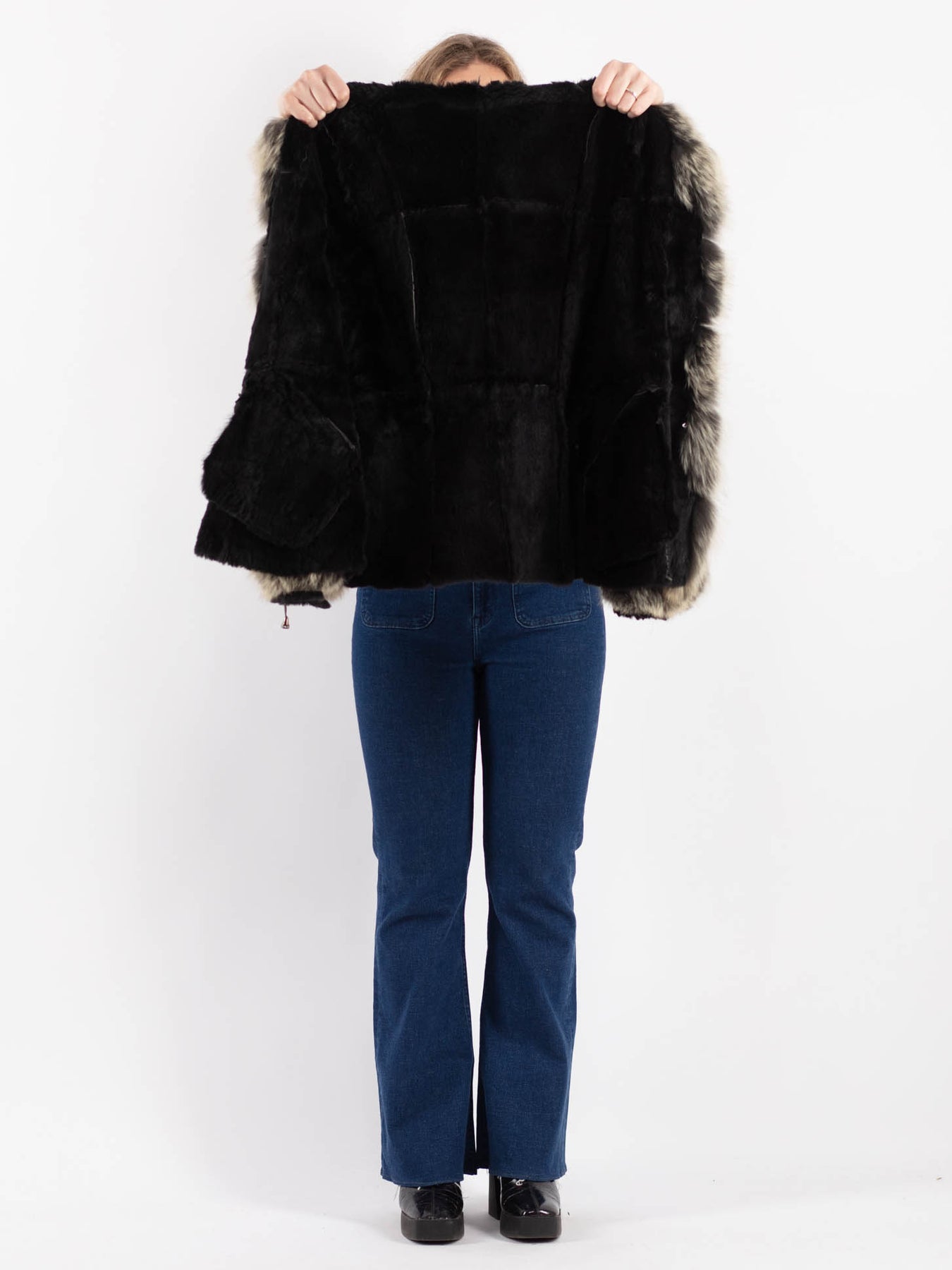 Vintage condition evaluation: 6/10 Shows moderate wear, fading, and some light overall surface bruising; the fur is slightly fluffing off; rather lightweight and flexible by design; some mended spots around the pocket corners