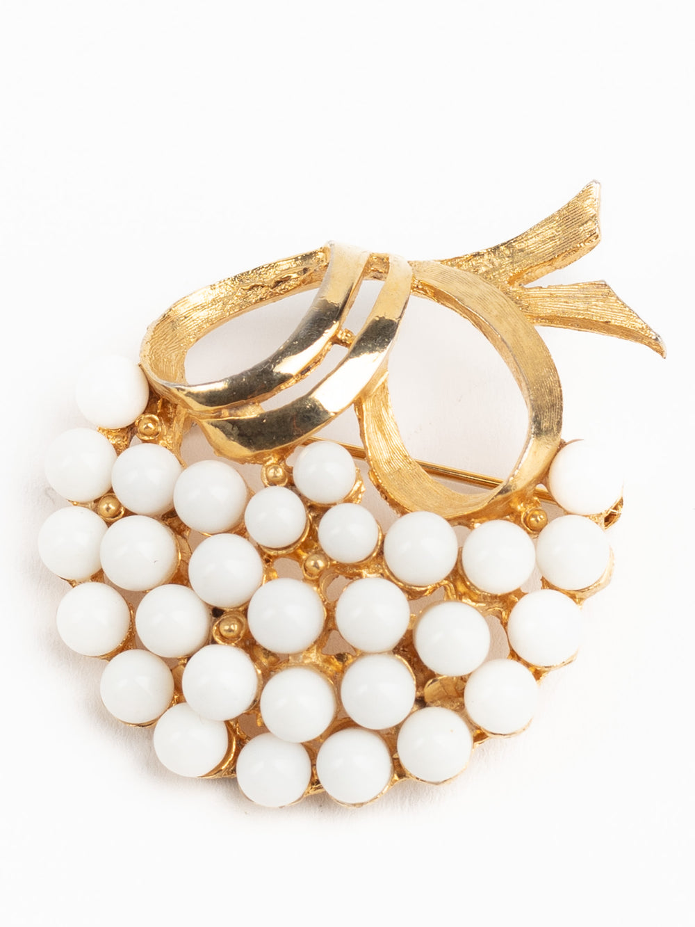 Vintage 50s REJA White Bead Bow Brooch – Gold-Tone Midcentury Cluster Pin