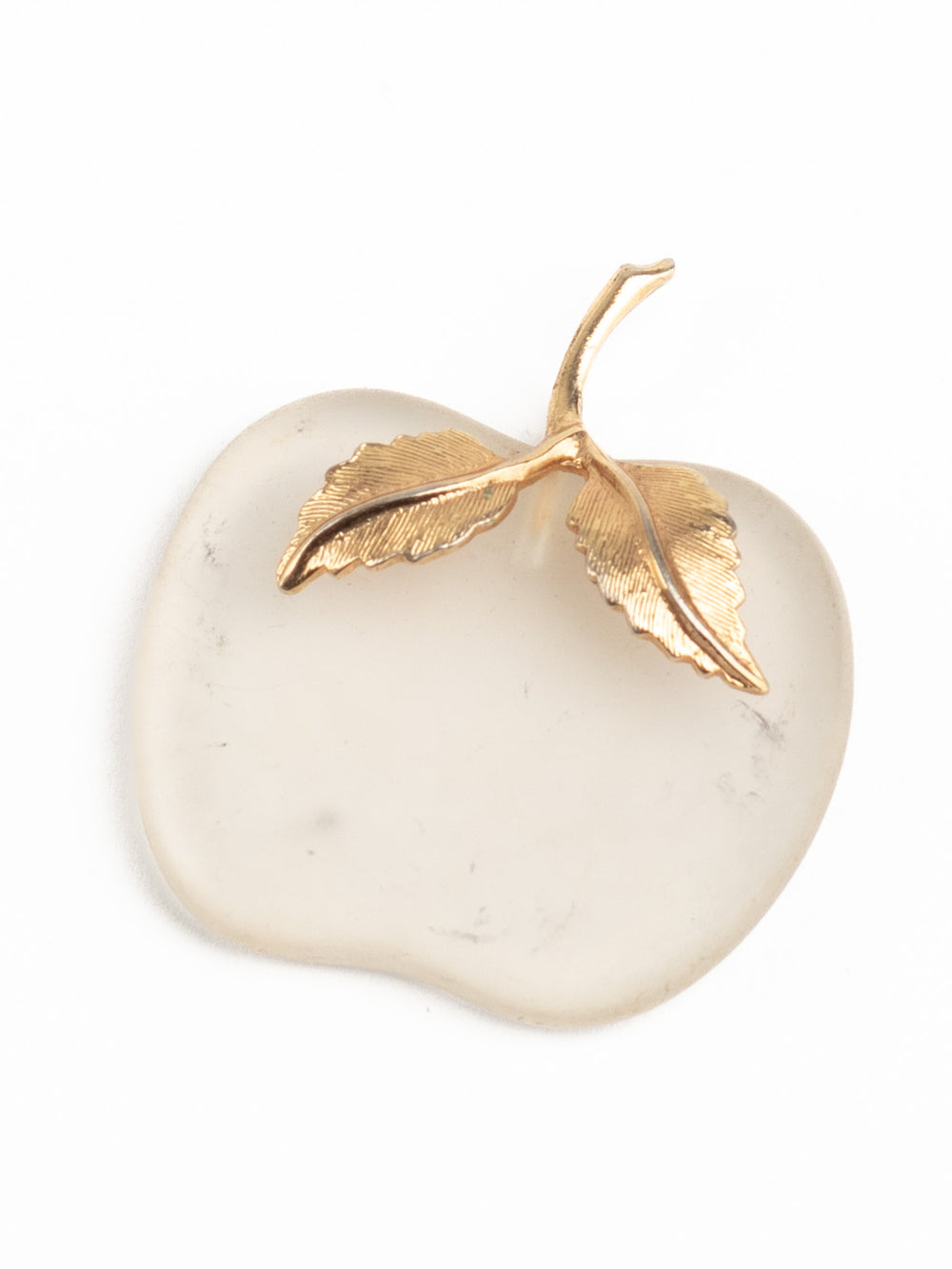 Charming vintage apple-shaped pendant crafted from frosted translucent glass with gold-tone metal leaf and stem details. A sweet, minimalist piece with a midcentury feel, perfect for lovers of nature-inspired or symbolic jewelry. Ideal as a teacher gift or a seasonal accessory.