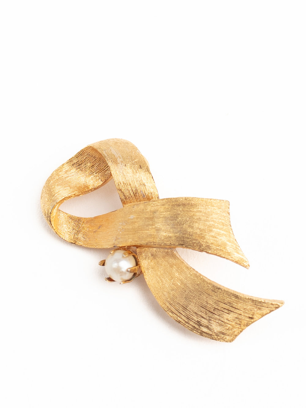 Vintage 60s Gold-Tone Ribbon Brooch with Faux Pearl – Midcentury Bow Pin