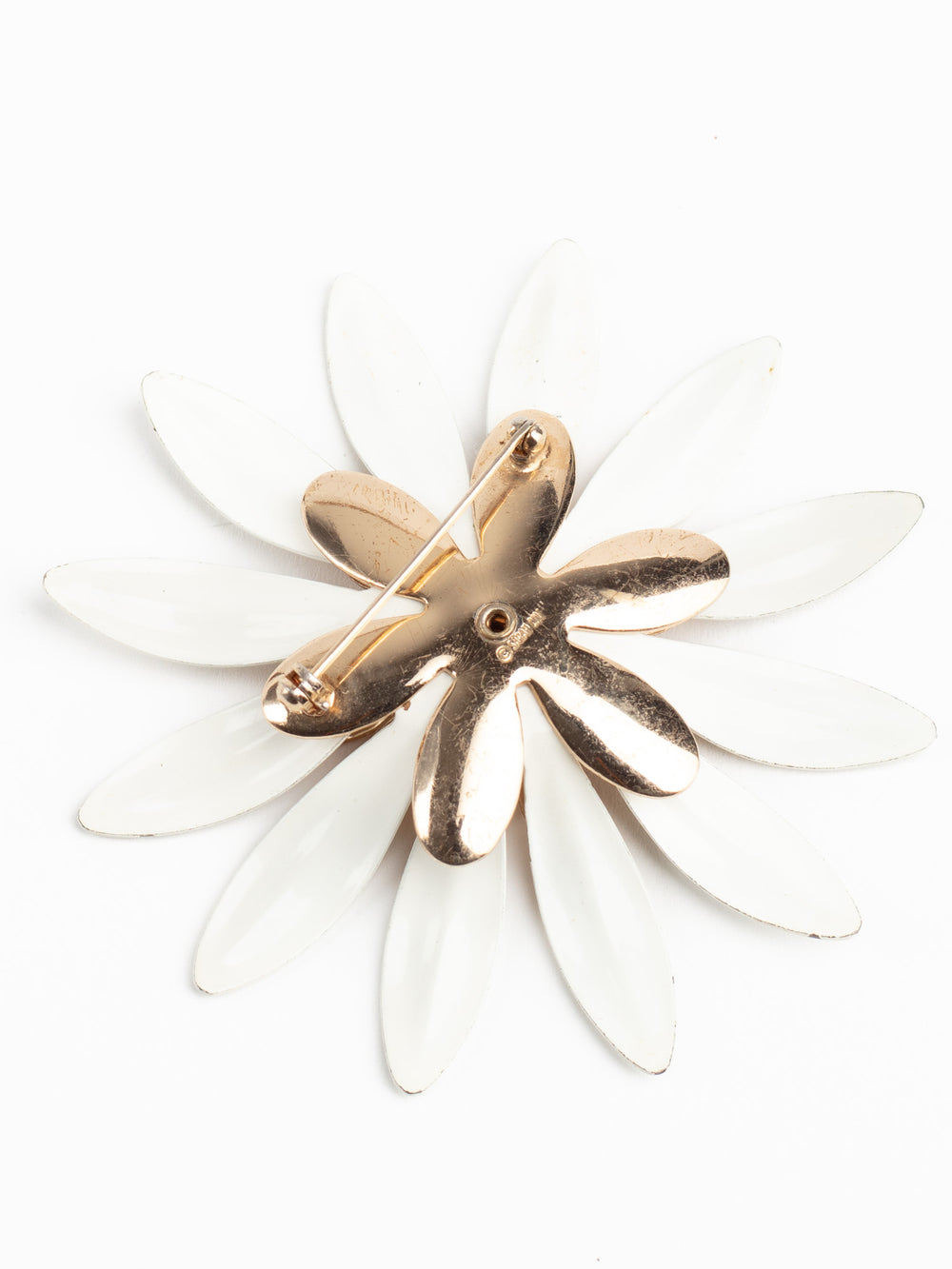 Bold and cheerful vintage daisy brooch in white and gold-tone enamel. A classic midcentury floral statement for mod lovers and collectors.