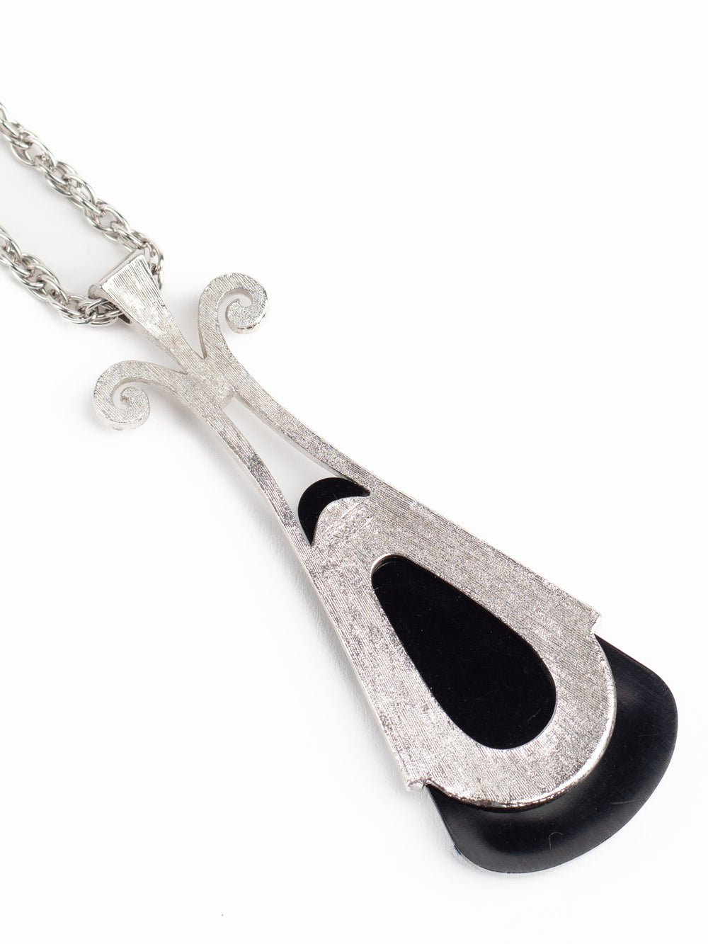 Vintage 70s AVON Silver-Tone Pendant Necklace with Black Teardrop Drop