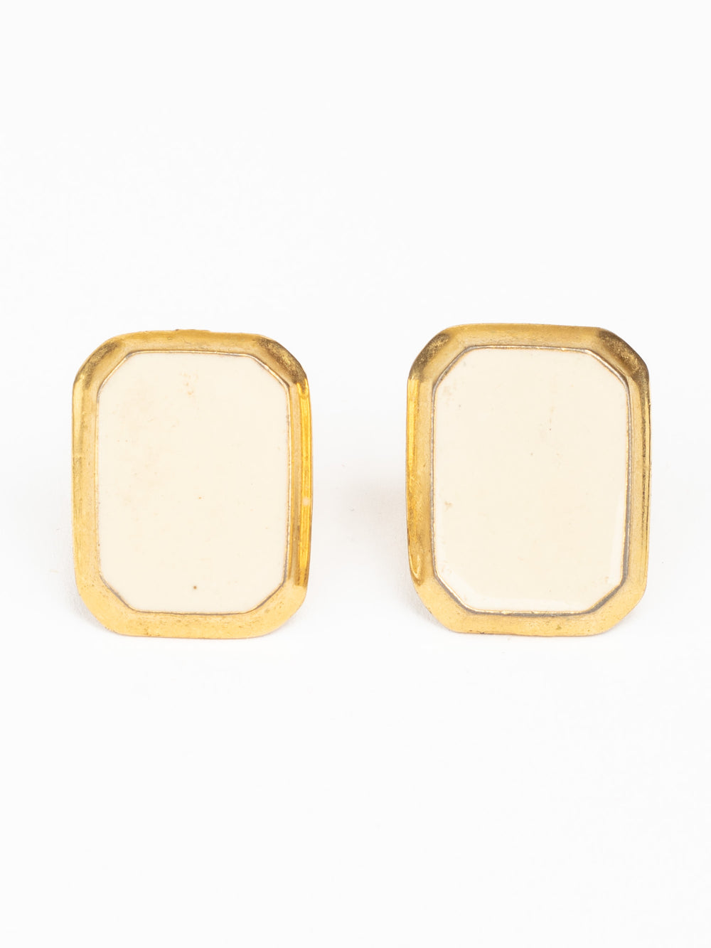 These vintage stud earrings from the 1980s feature a clean rectangular shape in cream-colored enamel framed with gold-tone metal. Their geometric design makes them a bold and modern statement piece, perfect for lovers of retro minimalism.