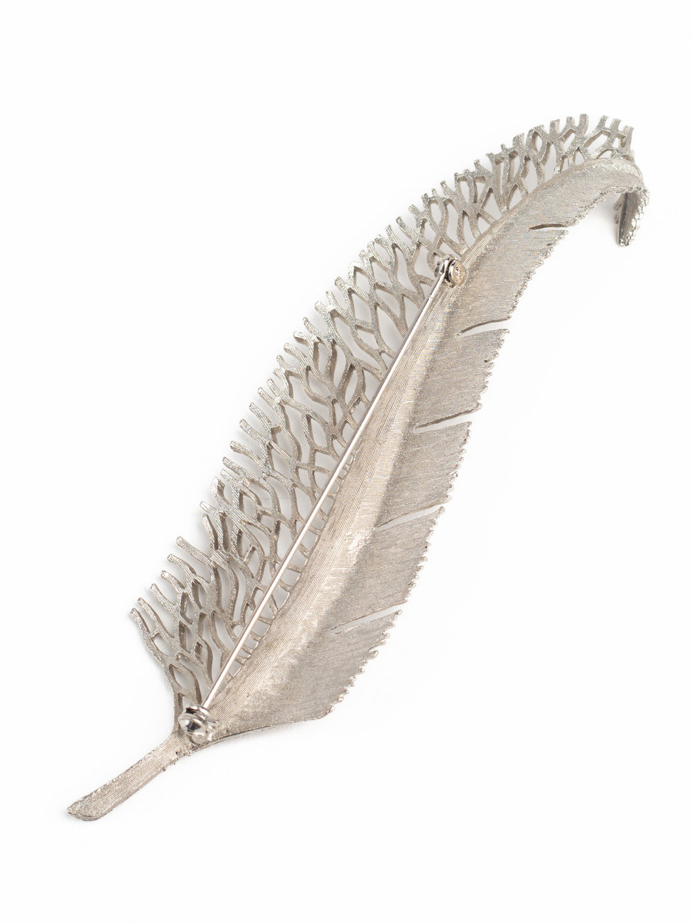 A striking vintage feather brooch in elegant silver tone metal, beautifully sculpted with fine textural detail and lacy openwork on one side. Nature-inspired and bold, this piece makes a sophisticated statement on any jacket, coat, or dress.