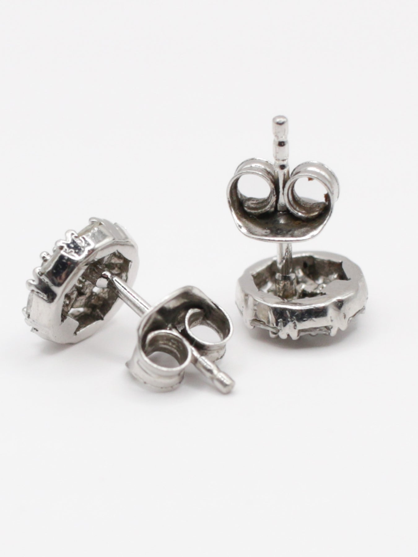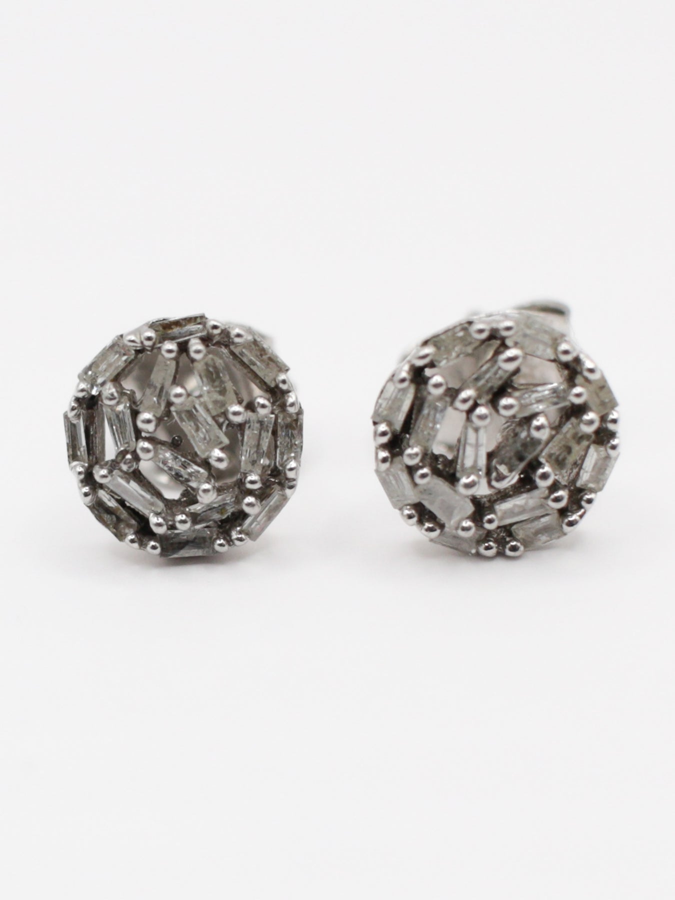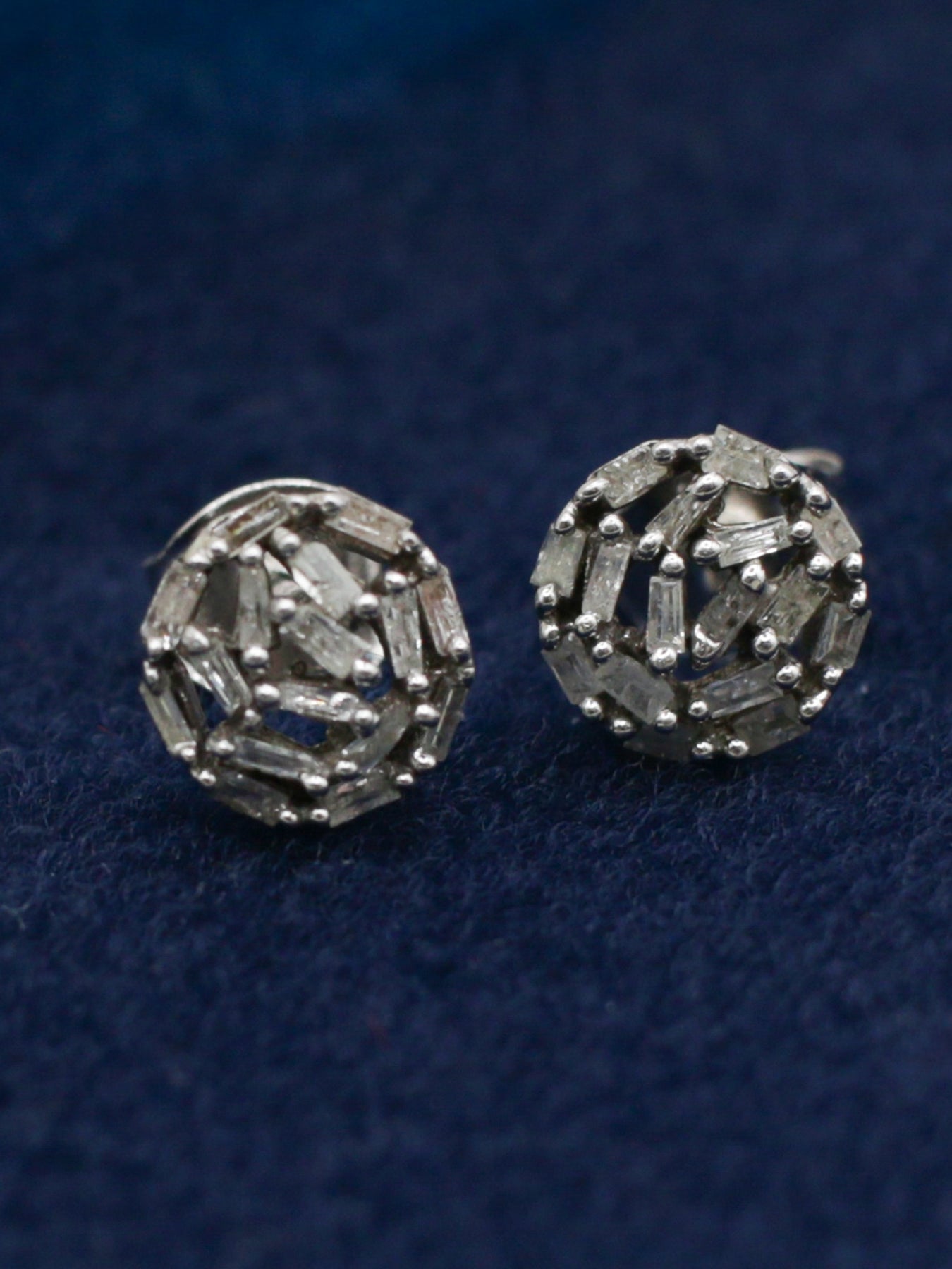 Small round rhinestone earrings in sterling silver. These lightweight studs feature a raised baguette rhinestone cluster design. A classic minimalist style from the 80s that pairs well with both casual and formal outfits.