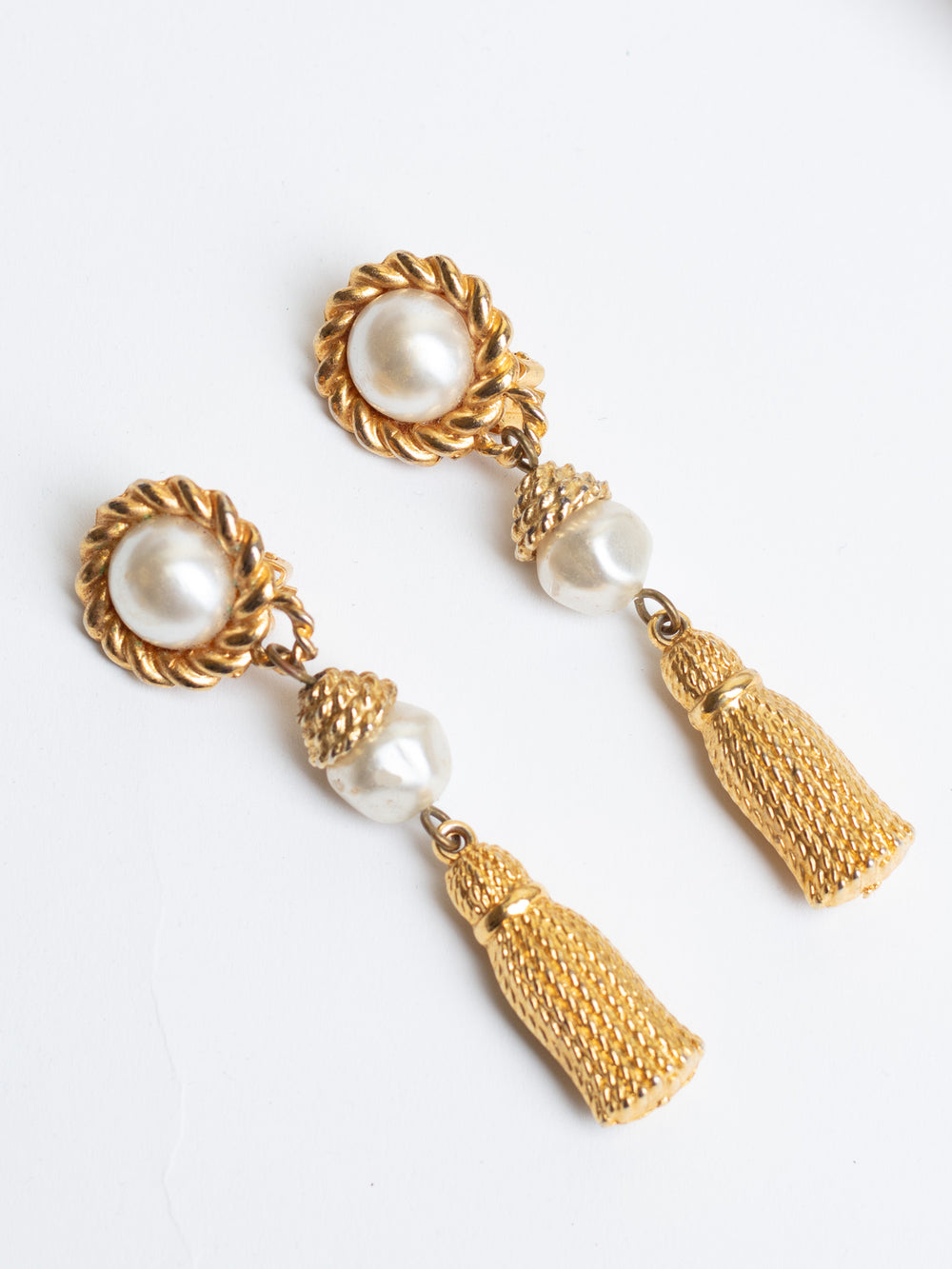Make a glamorous statement with these vintage clip-on earrings from the 1980s. Featuring a rope-textured gold-tone setting with large faux pearl cabochons, these earrings cascade down to elegant mesh-style tassels, accented by mid-section faux pearls and textured caps.