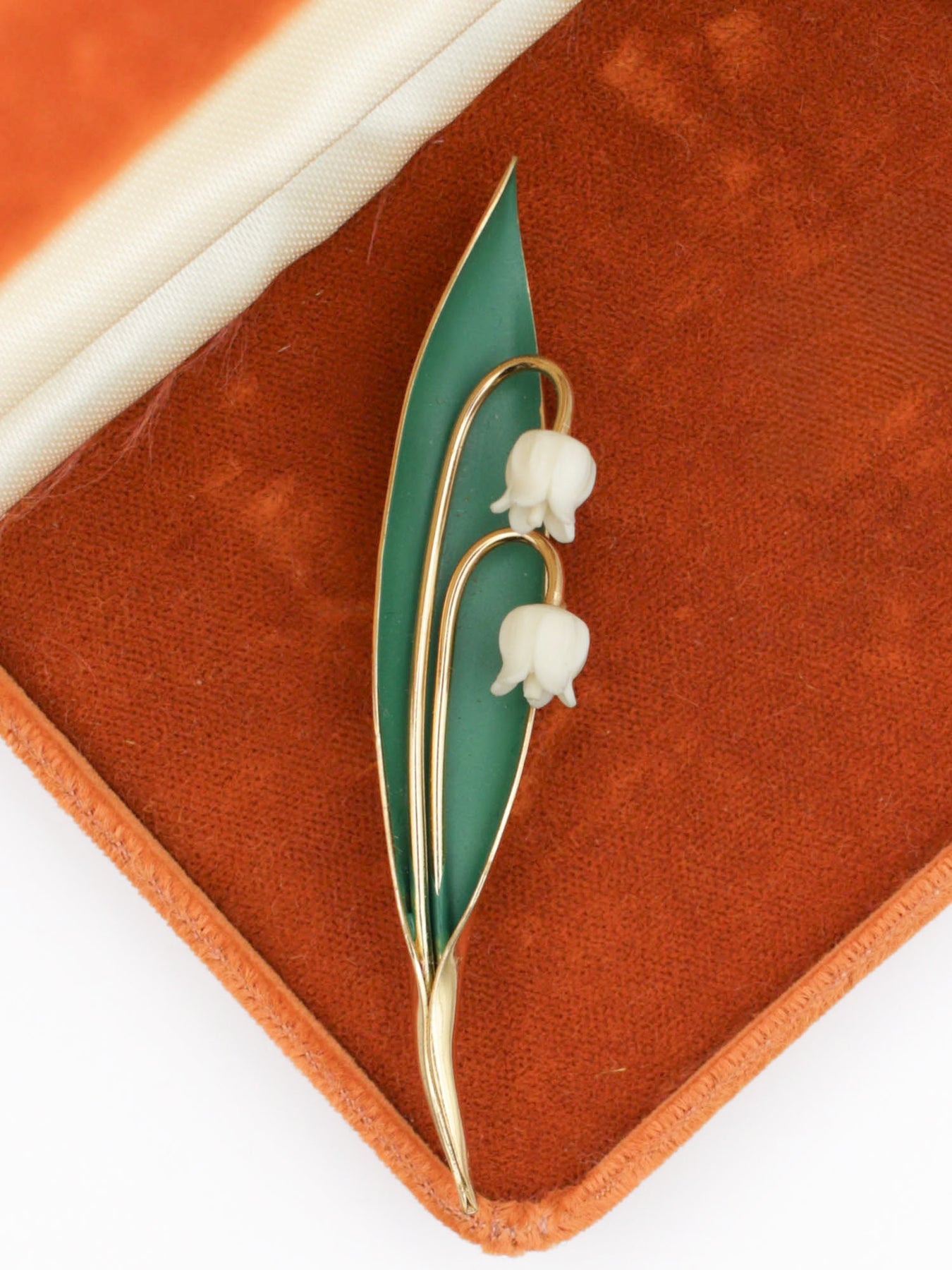 Vintage lily of the valley brooch in soft gold tone, featuring two white flower buds and a long green enamel leaf. A delicate, nature-themed piece with a clean and elegant shape. Light and easy to wear, perfect for spring outfits or as a gift.