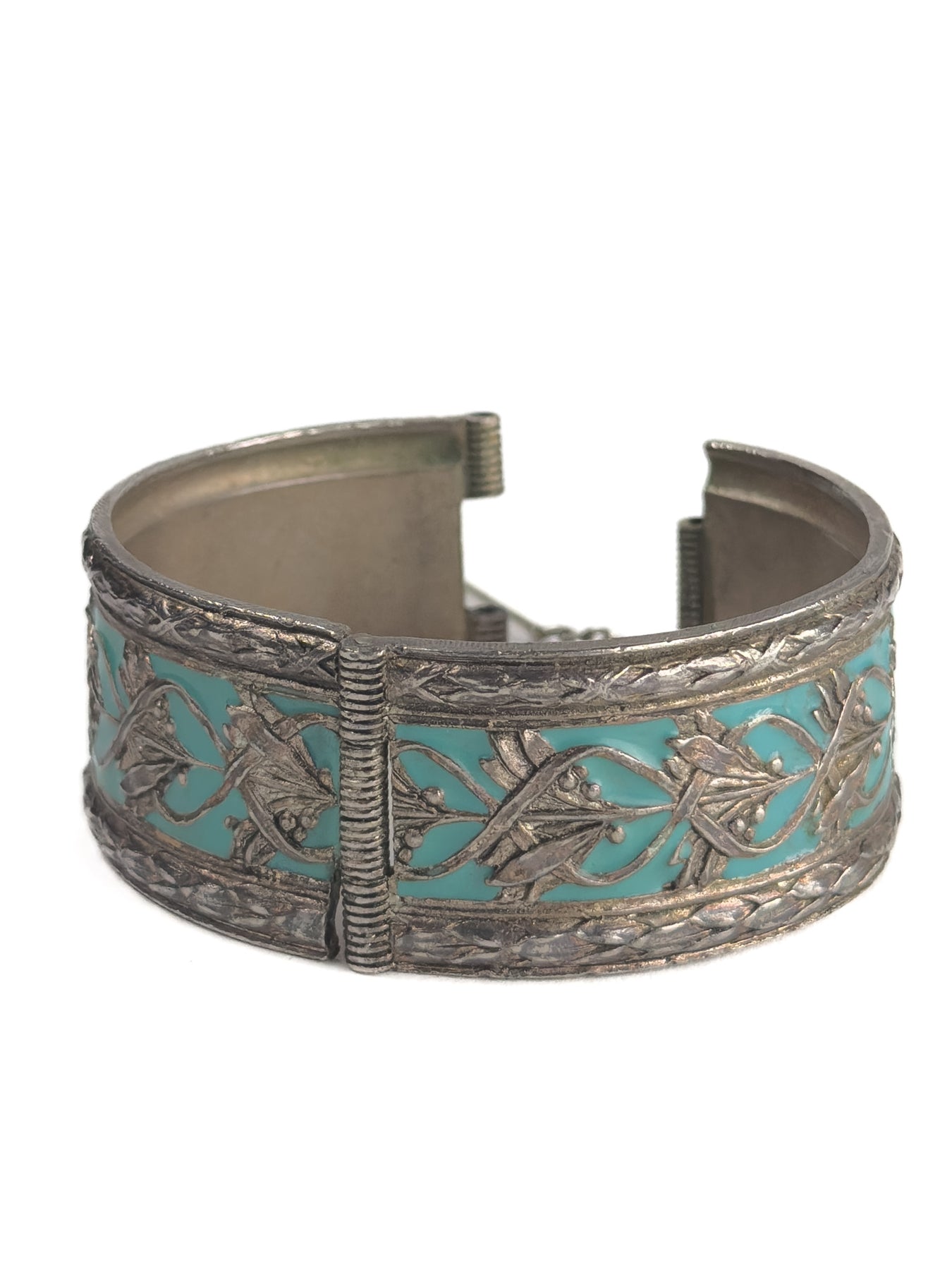 What it is: Kas tas ir: Vintage Silver Floral Hinged Bangle with Turquoise Enamel & Safety Chain
