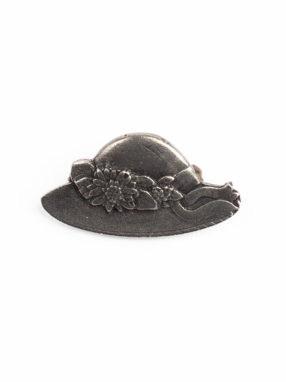 A charming limited-edition brooch shaped like a vintage cloche hat, detailed with raised flowers and ribbon. Released by Birds & Blooms in 2005, this antique silver-tone piece has a rustic, aged finish and is perfect for collectors or fans of feminine vintage accessories.