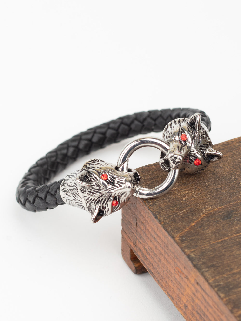 This men's bracelet features two detailed wolf head clasps with glowing red eyes, holding a central ring. The band is made of thick black braided leather, giving it a rugged, Viking-inspired look. A powerful statement piece for any outfit or gift for a Norse mythology fan.