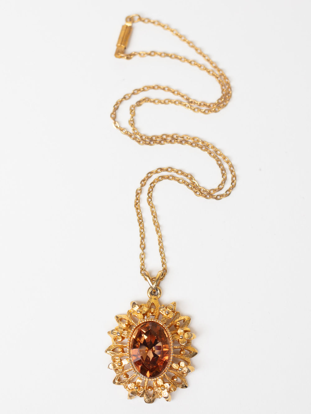 This stunning vintage pendant necklace from the 1960s features a faceted amber-colored glass stone set in an ornate gold-tone floral frame. The oval pendant hangs from a classic textured chain, creating a warm and eye-catching retro statement piece.