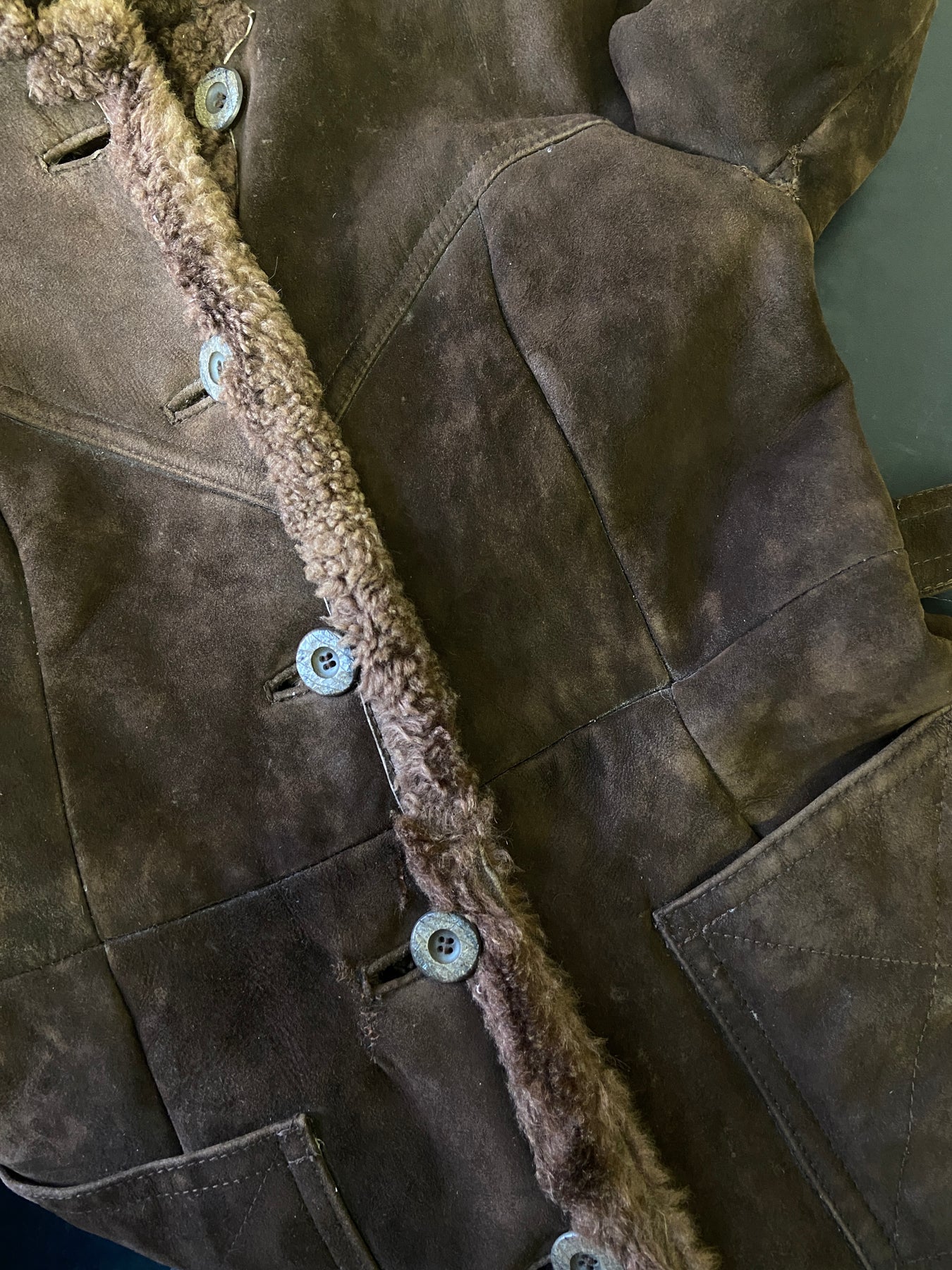 Vintage condition evaluation: 5/10 Visible overall vintage wear with fading and surface bruising across the suede. Some wool has rubbed off on the interior panels and lightly around the hemline. Multiple small mended areas are present: hand-stitched repairs around the buttonholes and another repaired spot under the left arm (shown in the last photo)