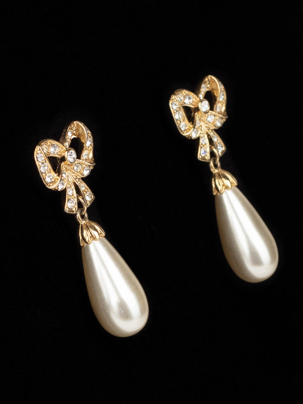 These elegant vintage earrings from the 1980s feature sparkly gold-tone bows set with clear rhinestones and finished with teardrop-shaped faux pearls. They’re perfect for a dressy occasion, adding charm and sparkle with a playful vintage touch.