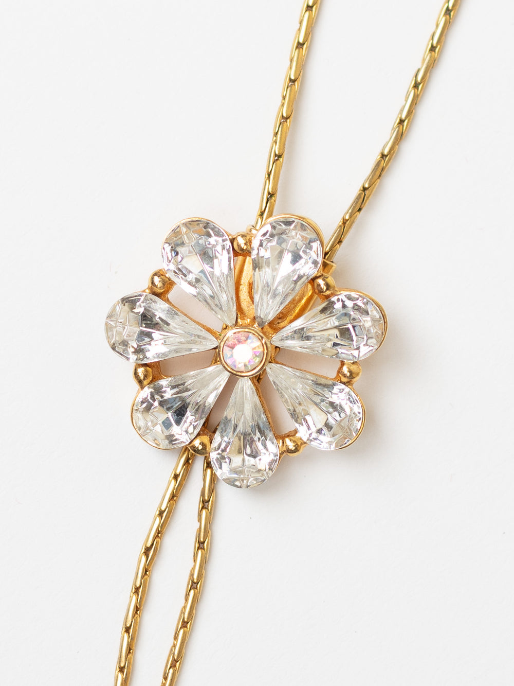 This vintage floral pendant necklace from the 1980s features a daisy-shaped centerpiece made of teardrop and baguette-cut glass crystals. The pendant sits on a sleek gold-tone adjustable lariat-style chain, finished with two faux pearl tips.
