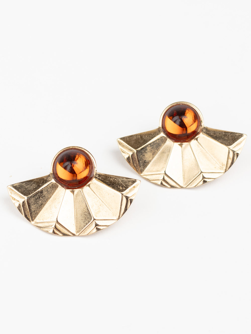 Vintage 80s Fan-Shaped Earrings with Amber Glass Cabochons