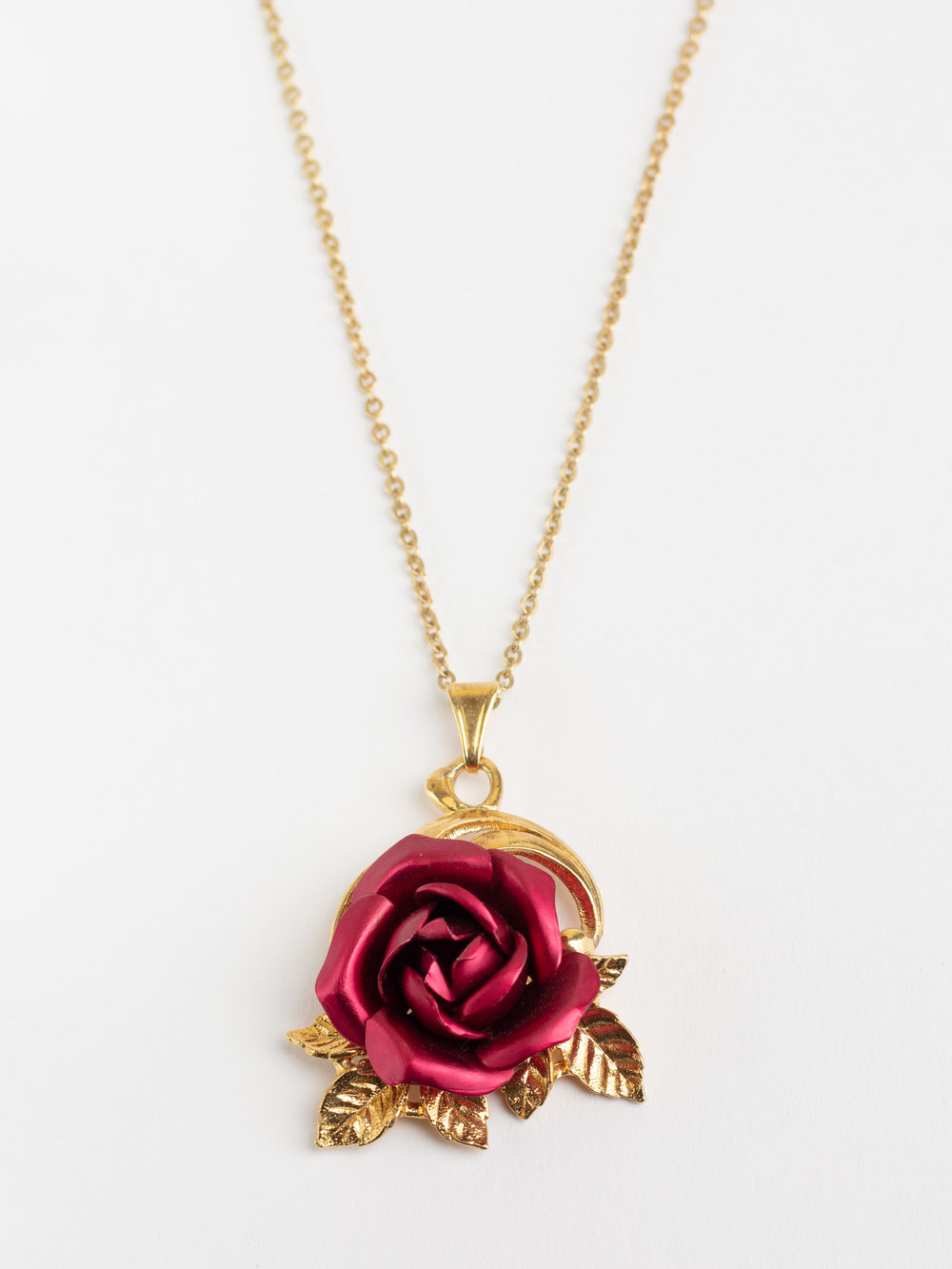This vintage necklace features a romantic red enamel rose set in a gold-tone pendant with leaf details, hanging from a classic gold-tone chain. A beautiful floral statement piece perfect for special occasions or everyday wear.