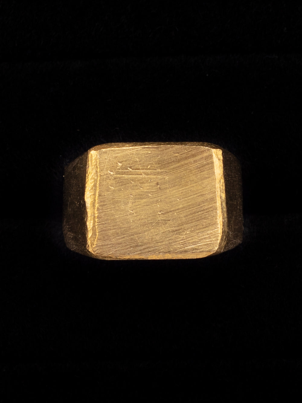 This vintage gold-tone signet ring features a simple flat rectangular face with a raw, brushed finish. Great for wearing as-is or for engraving, a retro piece with industrial charm.