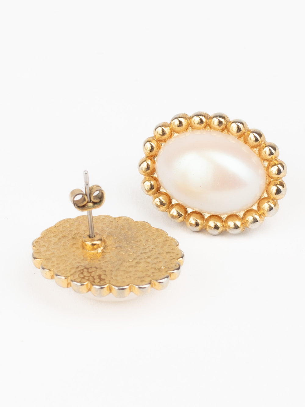 These vintage earrings feature large oval faux pearls framed by a beaded gold-tone border. A timeless and elegant design, these post earrings are perfect for both everyday wear and dressier occasions. They reflect the classic style of the 1980s.