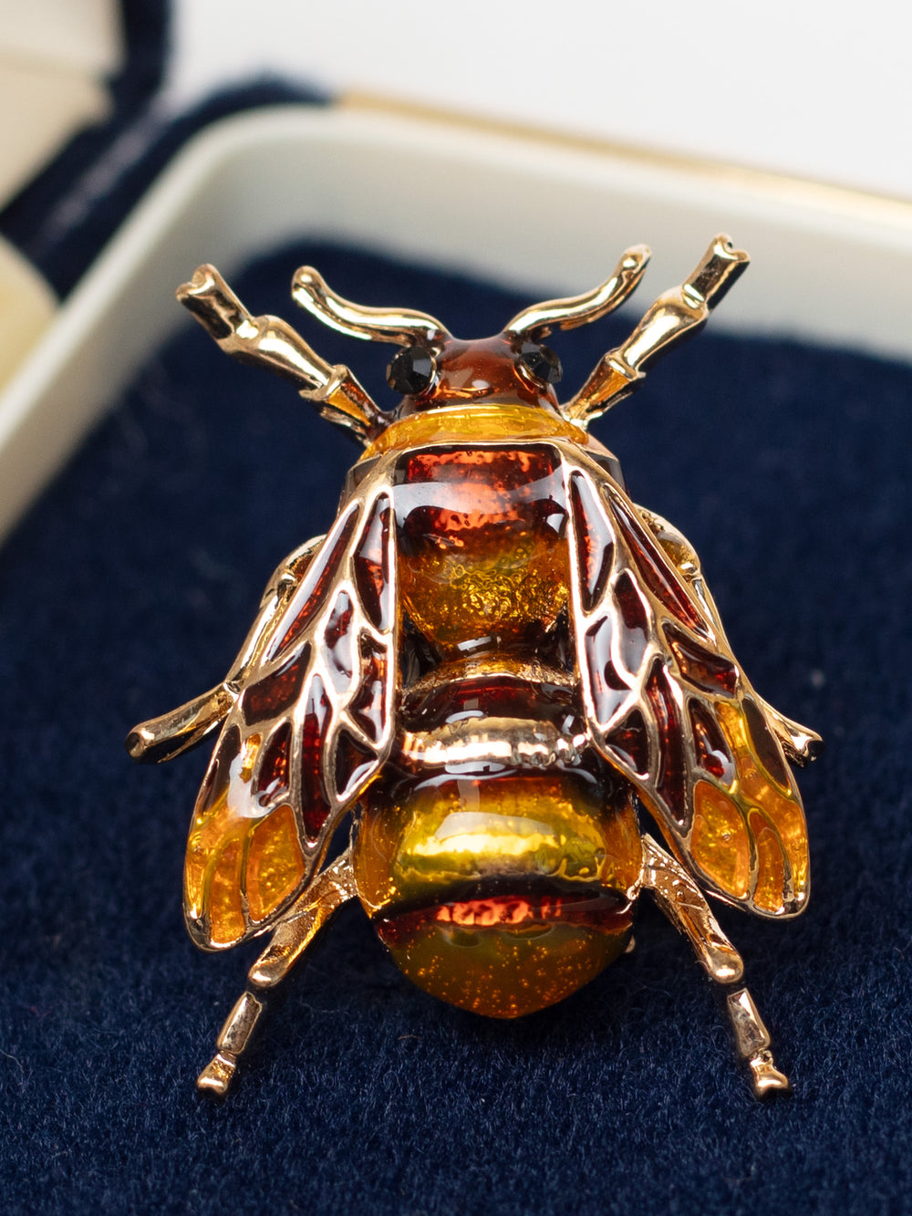 This vintage brooch from the 1990s features a detailed enamel bee in rich amber, brown, and golden tones. The wings are delicately outlined in gold-tone metal, and the body is finished with a glossy translucent enamel giving it a realistic shimmer.