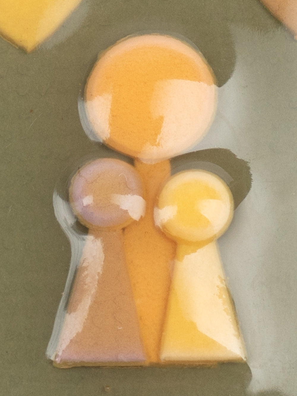 Charming handmade brooch by Lucinda from her collectible 1990s “People Pins” series. This design features a warm-toned family trio set against a soft olive green background with two heart details. Hand-layered in resin over wood, this piece celebrates connection and love in a unique, folk-art-inspired style.