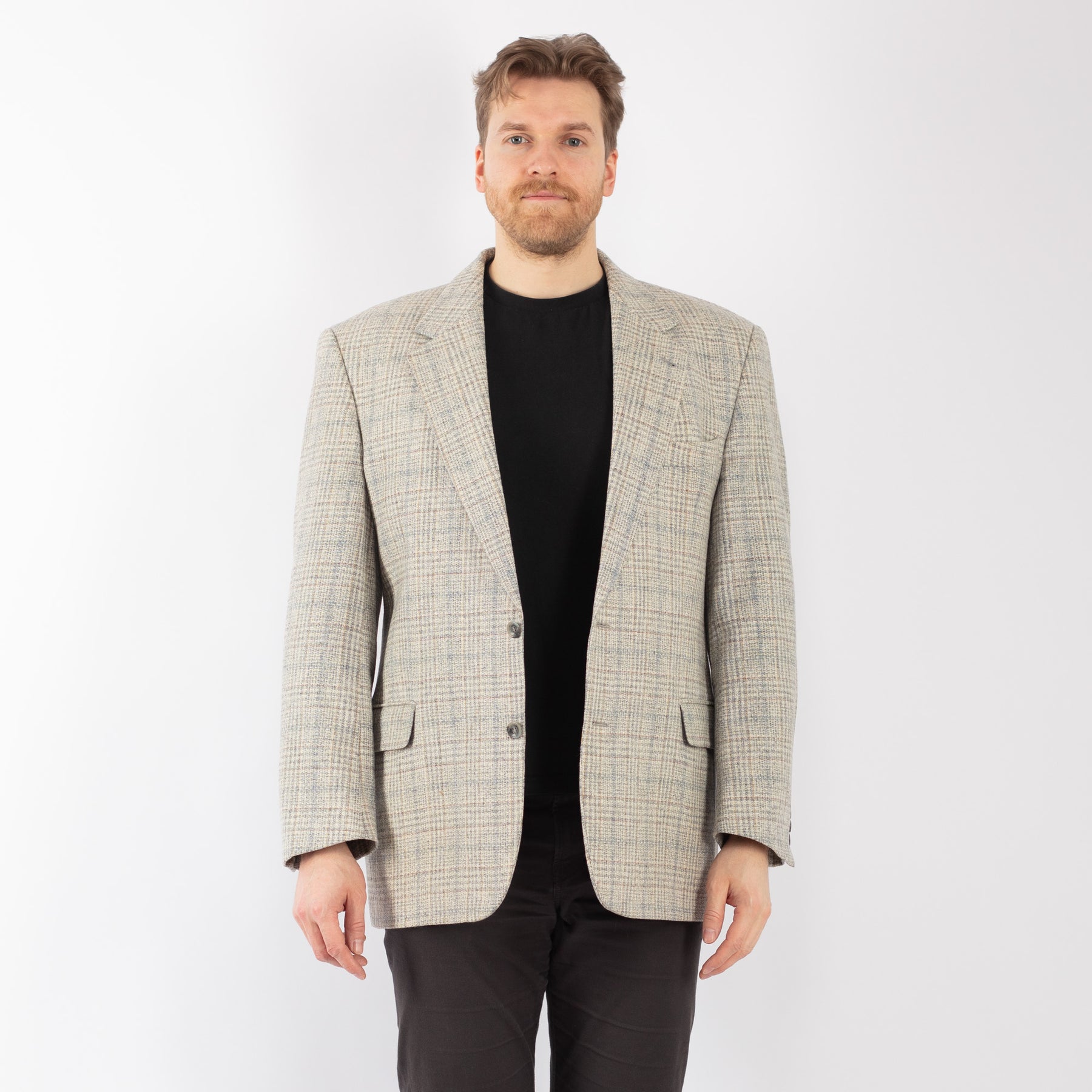 Vintage 90's Men Wool Blazer Jacket in Beige Blue