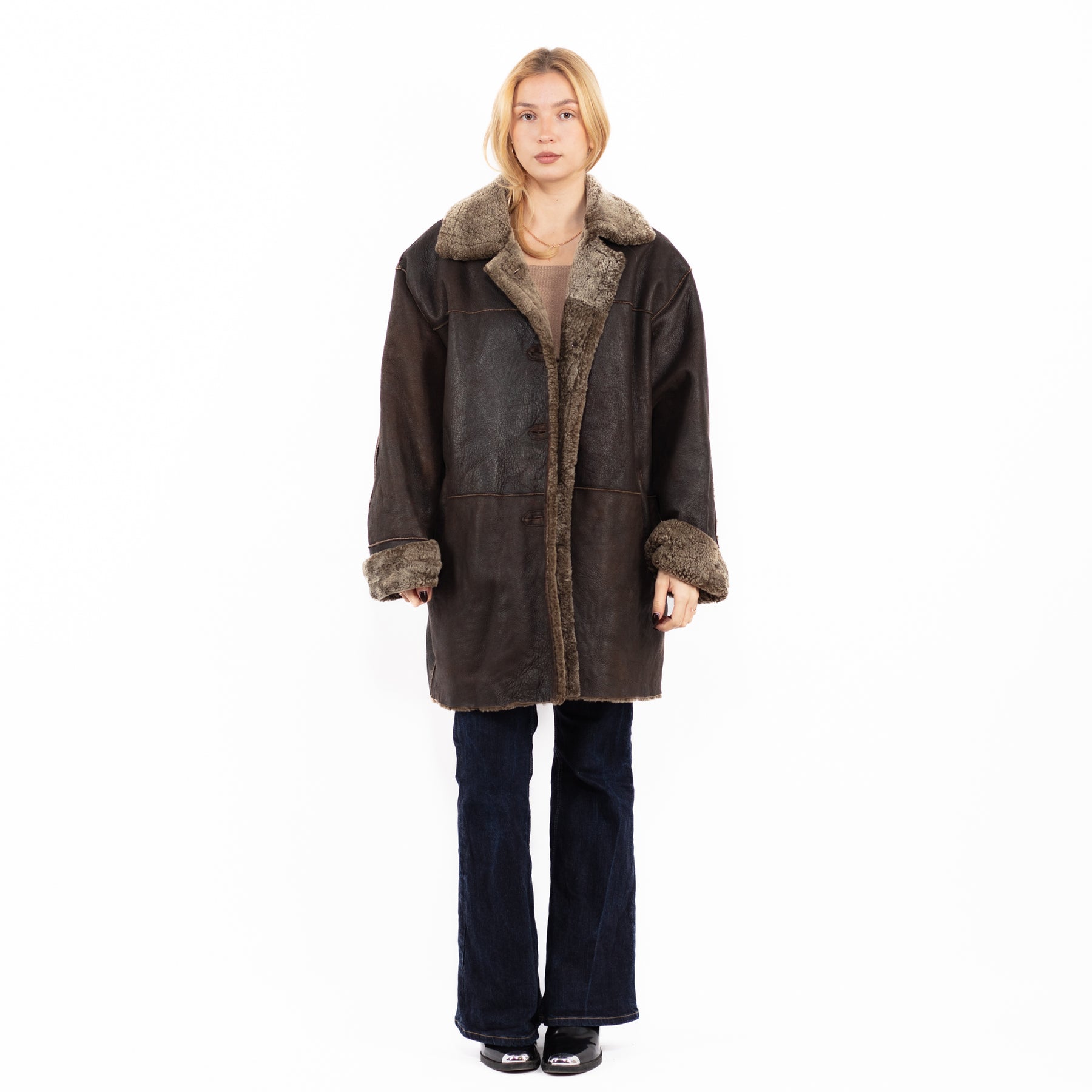 Vintage 90's Women Oversized Sheepskin Coat in Brown